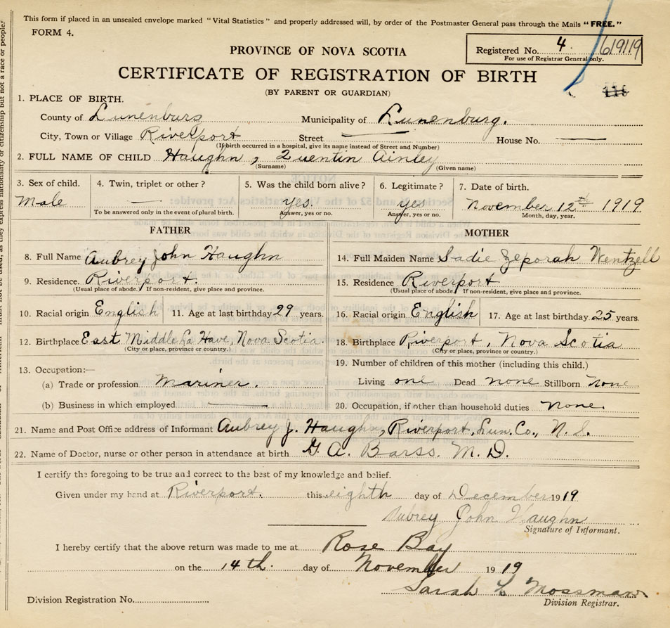 21. Name and Post Office address of Informant Aubrey J. Haughn Riverport, Lunenburg Co., NS