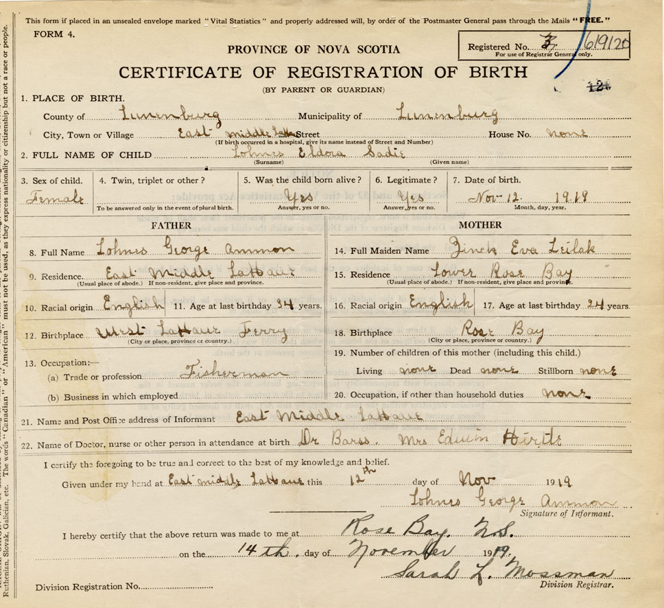 21. Name and Post Office address of Informant East Middle LaHave, Lunenburg Co., NS
