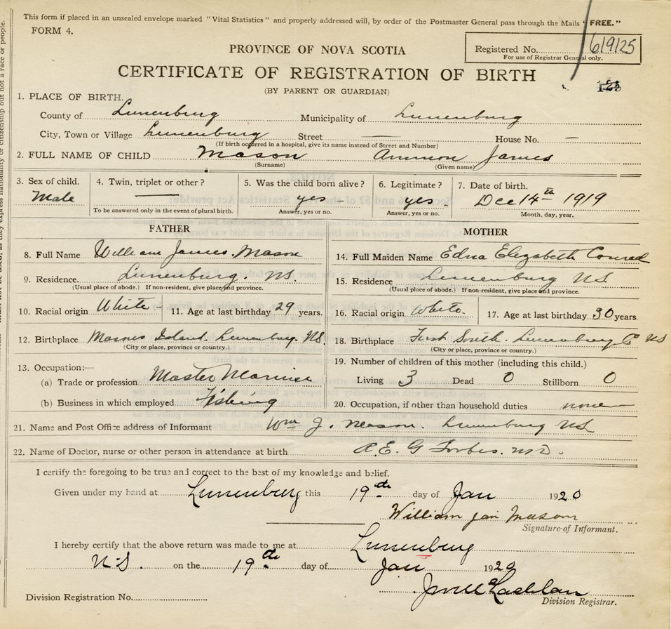 21. Name and Post Office address of Informant William J. Mason Lunenburg, NS