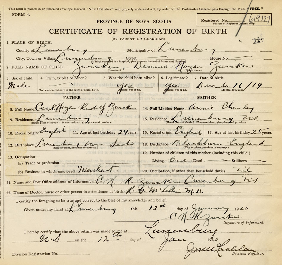 21. Name and Post Office address of Informant C. H. R. Zwicker Lunenburg, NS