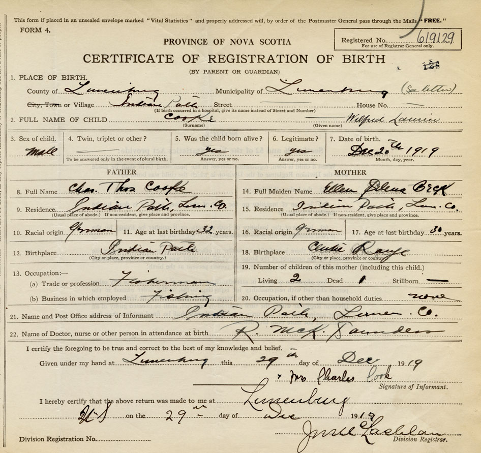 21. Name and Post Office address of Informant Mrs. Charles Cooke Indian Point, Lunenburg Co.