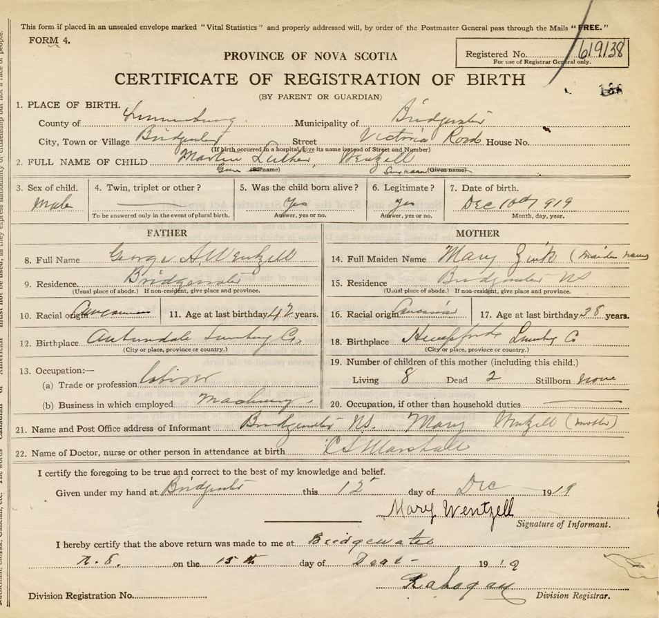 21. Name and Post Office address of Informant Mary Wentzell Bridgewater, Lunenburg Co., NS
