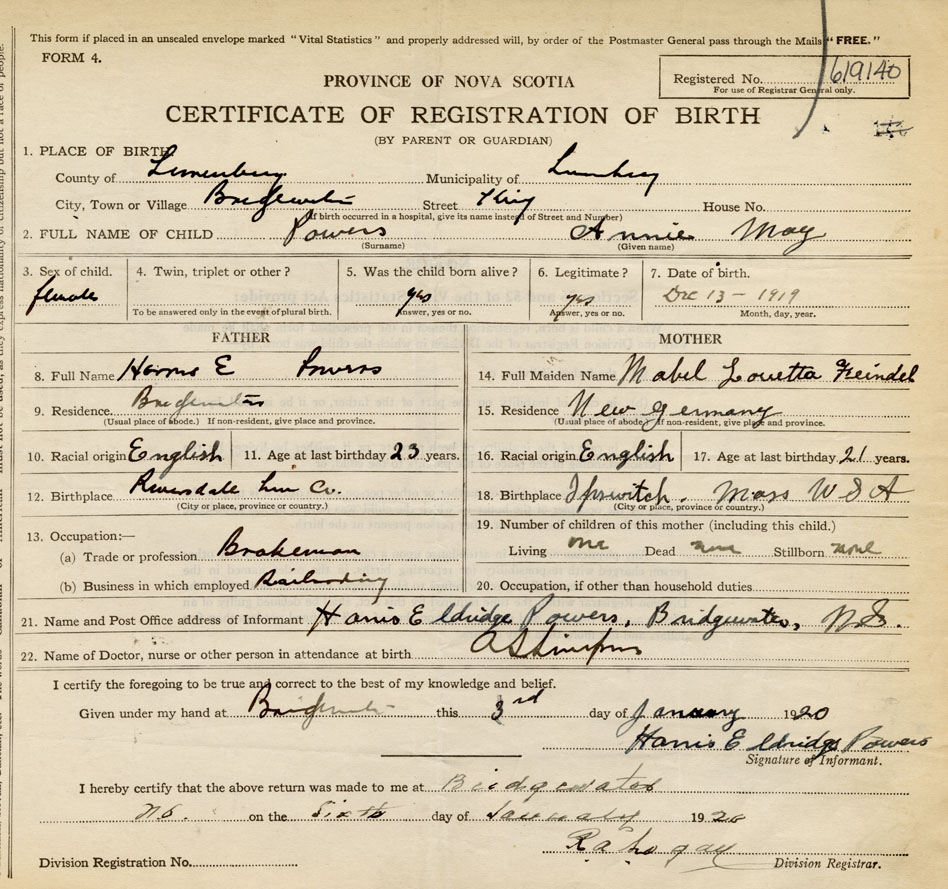 21. Name and Post Office address of Informant Harris Eldridge Powers Bridgewater, Lunenburg Co., NS