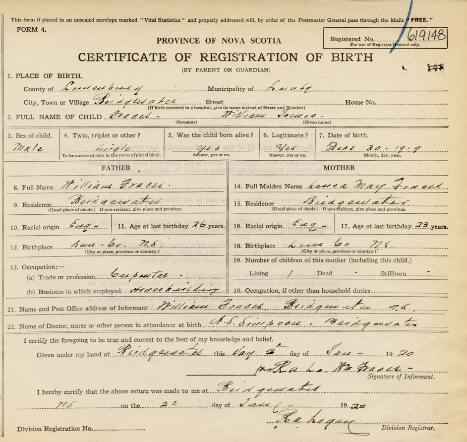 21. Name and Post Office address of Informant William Fraser Bridgewater, Lunenburg Co., NS