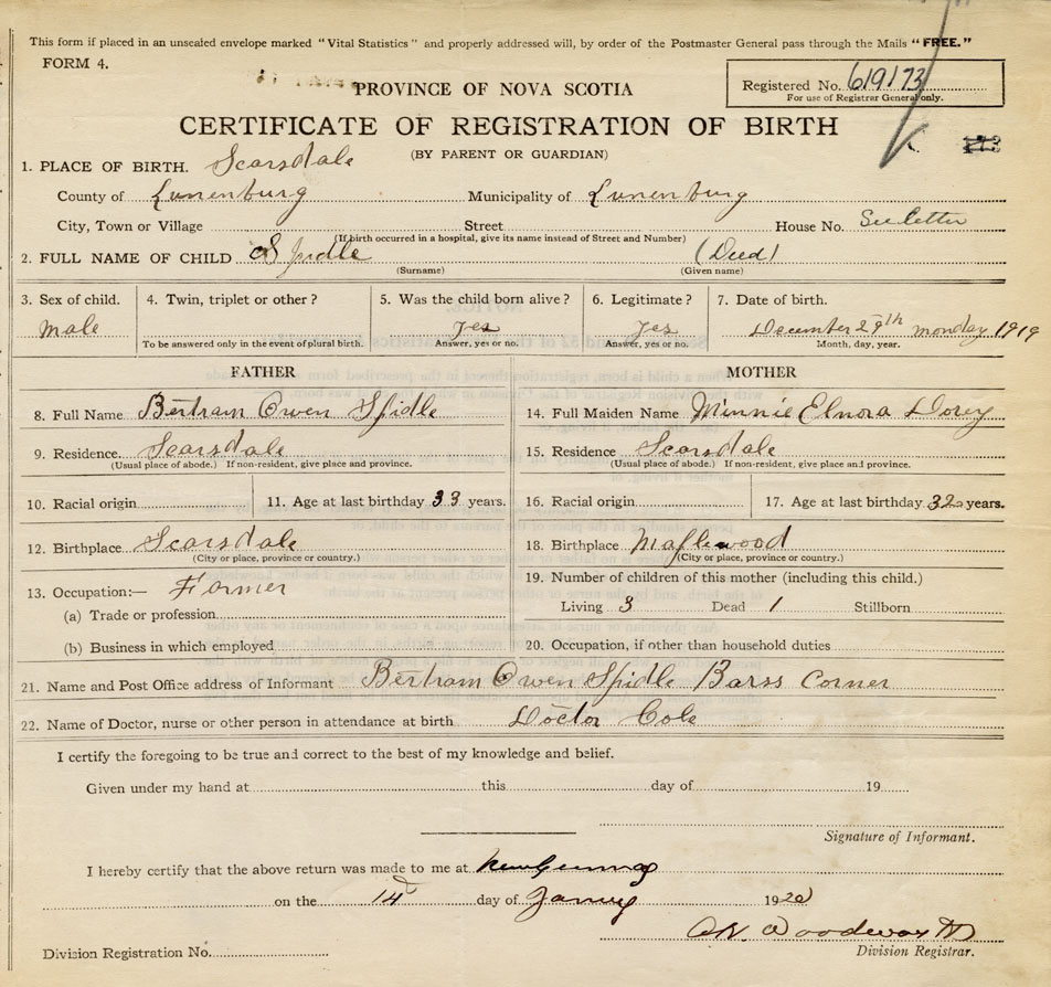 21. Name and Post Office address of Informant Bertram Owen Spidle Barss Corner