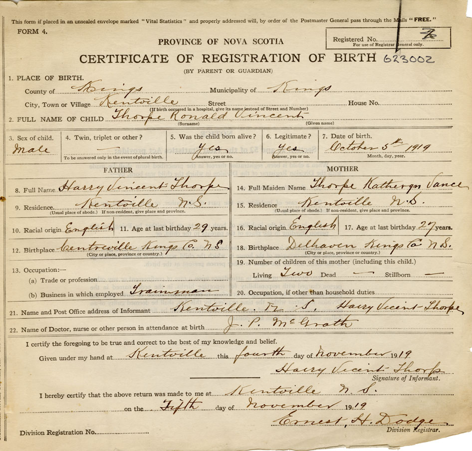 21. Name and Post Office address of Informant Harry Vincent Thorpe Kentville