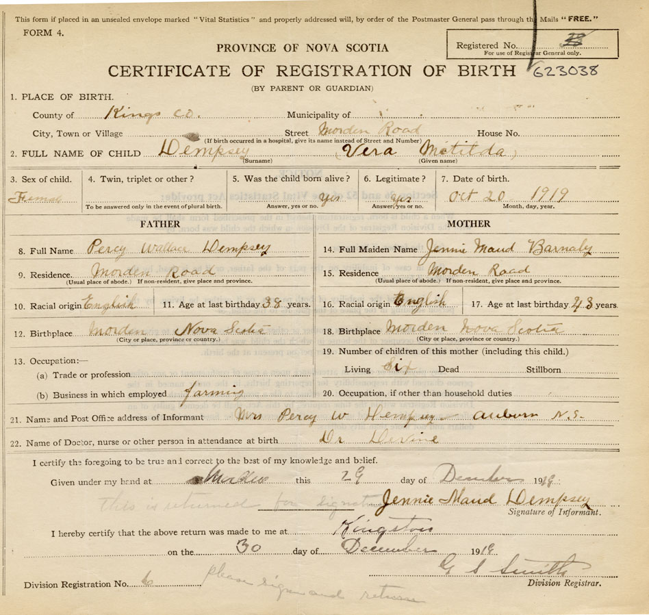 21. Name and Post Office address of Informant Mrs. Percy W. Dempsey Auburn, Kings Co., NS