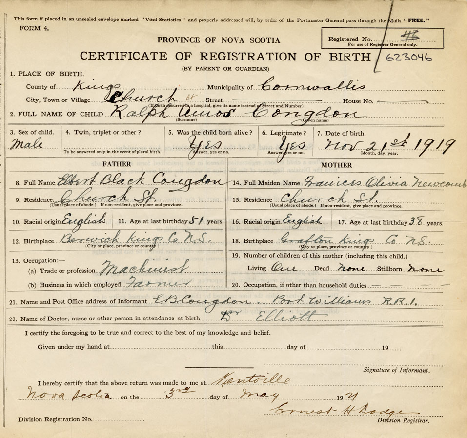 21. Name and Post Office address of Informant E. B. Congdon RR #1, Port Williams, Kings Co., NS