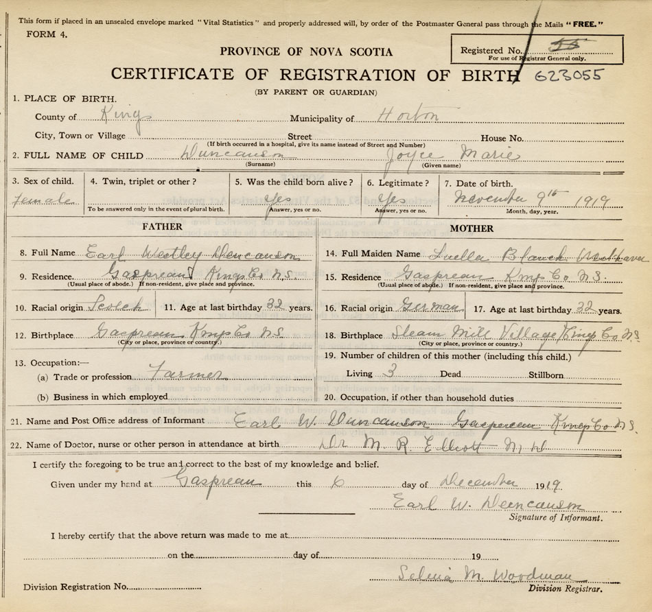21. Name and Post Office address of Informant Earl W. Duncanson Gaspereau, Kings Co., NS