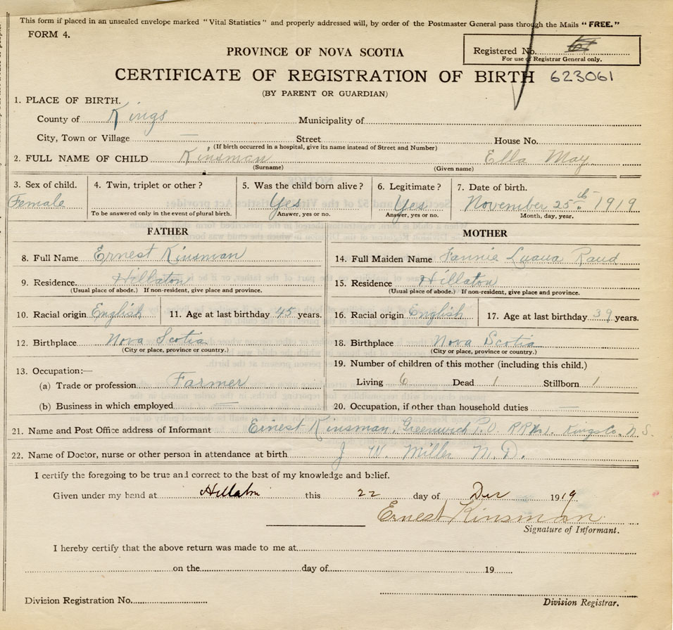 21. Name and Post Office address of Informant Ernest Kinsman RR #1, Greenwood, Kings Co., NS