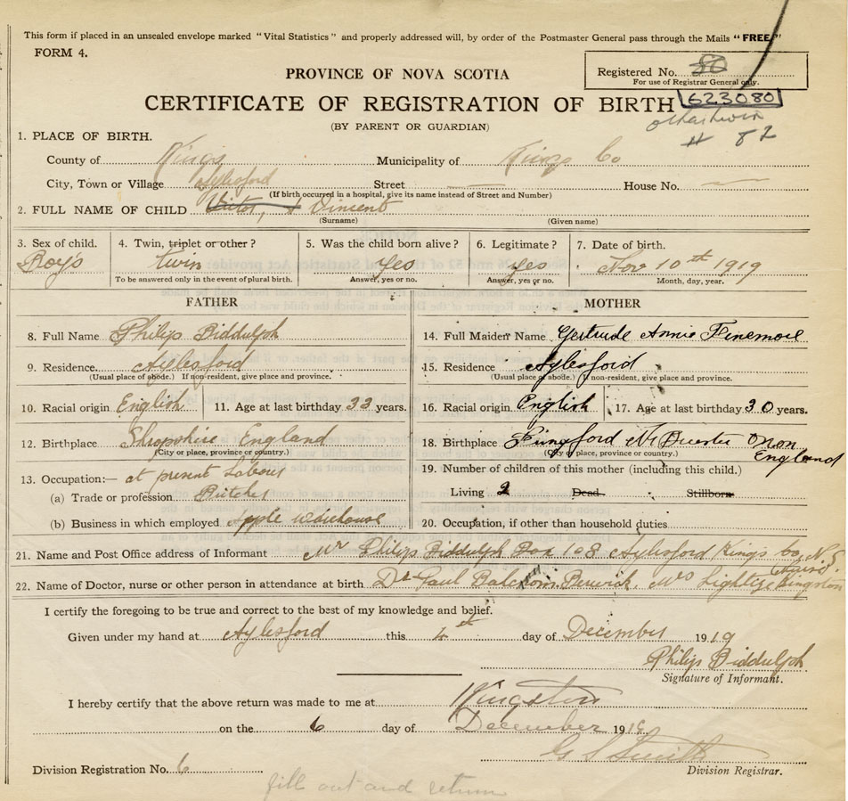 21. Name and Post Office address of Informant Mr. Philip Biddulph Box 108, Aylesford, Kings Co., NS