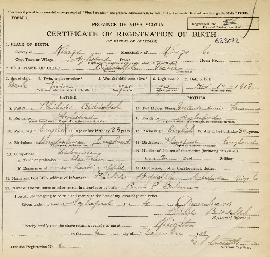 21. Name and Post Office address of Informant Philip Biddulph Aylesford, Kings Co., NS