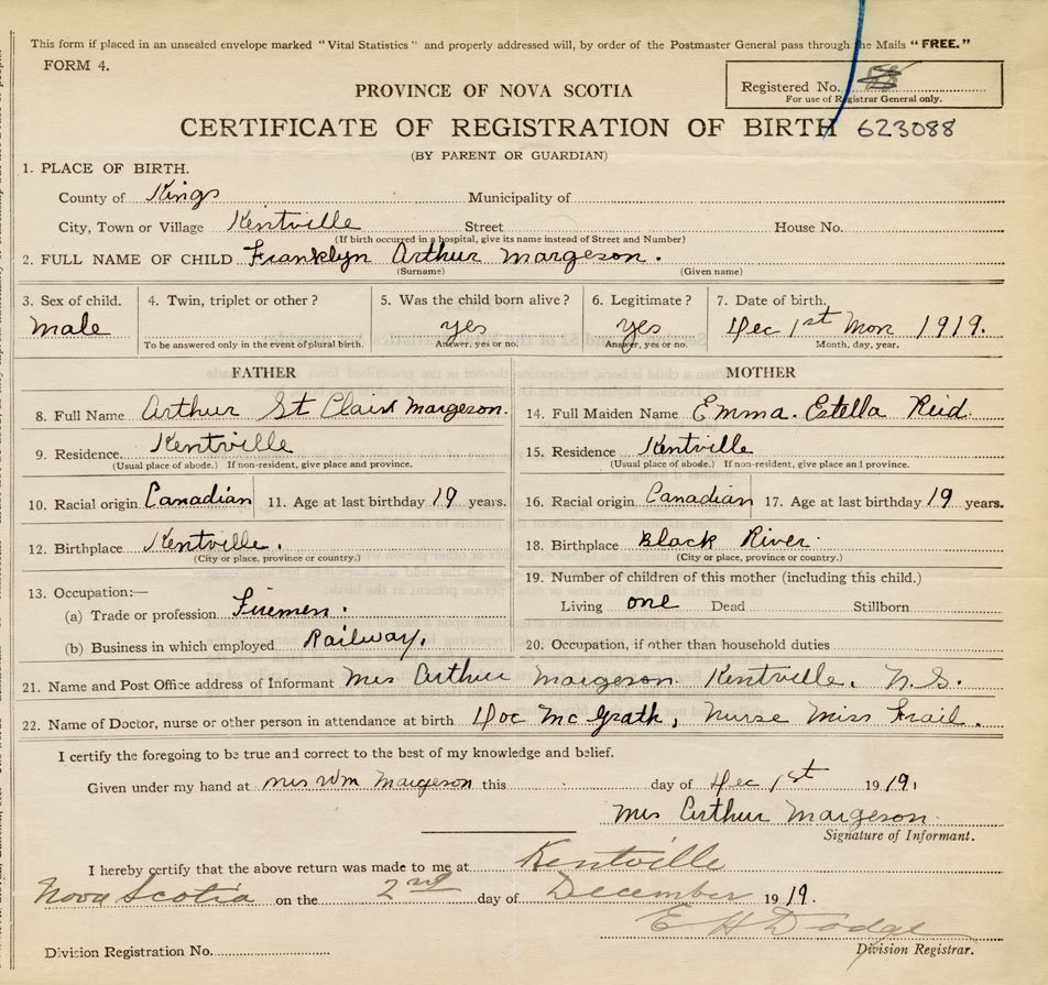 21. Name and Post Office address of Informant Mrs. Arthur Margeson Kentville, Kings Co., NS