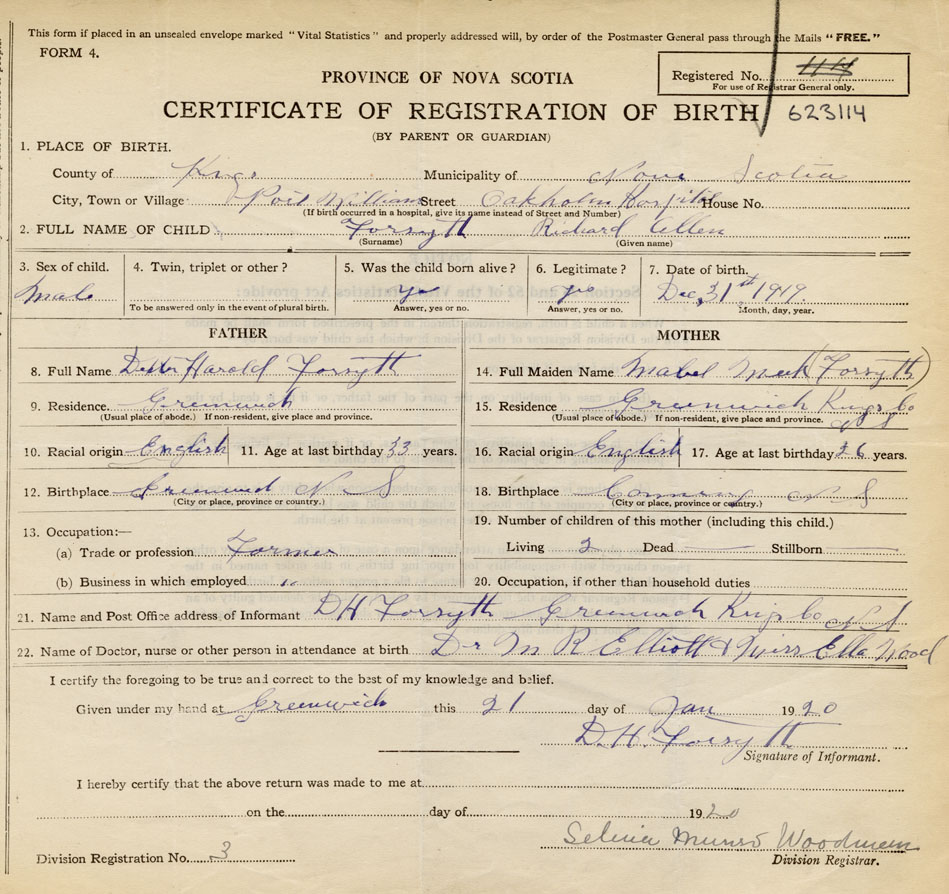 21. Name and Post Office address of Informant D. H. forsyth Greenwich, Kings Co., NS