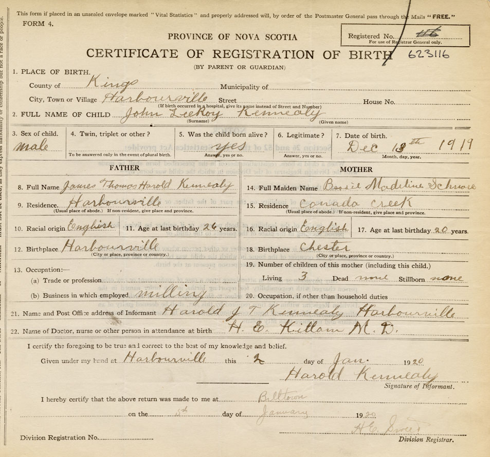 21. Name and Post Office address of Informant Harold J. T. Kennealy Harbourville, Kings Co., NS