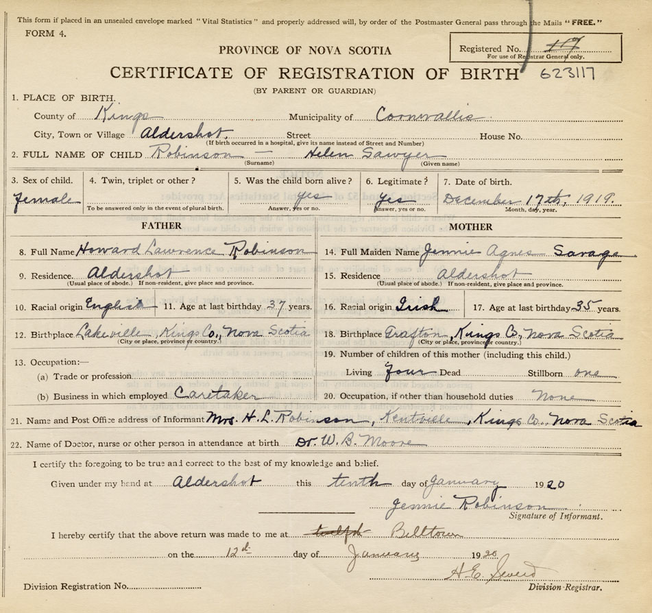 21. Name and Post Office address of Informant Mrs. H. L. Robinson Kentville, Kings Co., NS