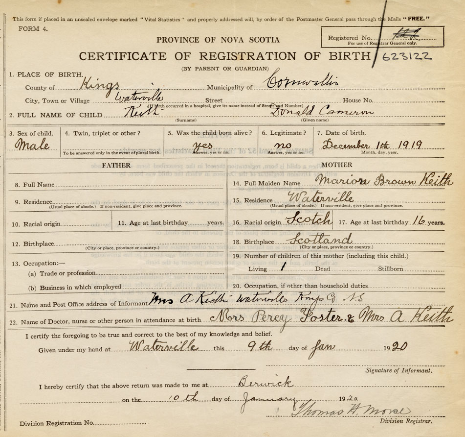 21. Name and Post Office address of Informant Mrs. A. Keith Waterville, Kings Co., NS