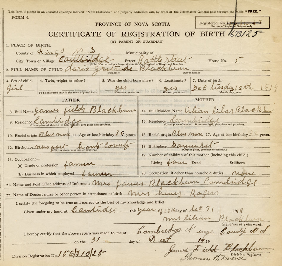 21. Name and Post Office address of Informant Mrs. James Blackburn Cambridge, Kings Co., NS