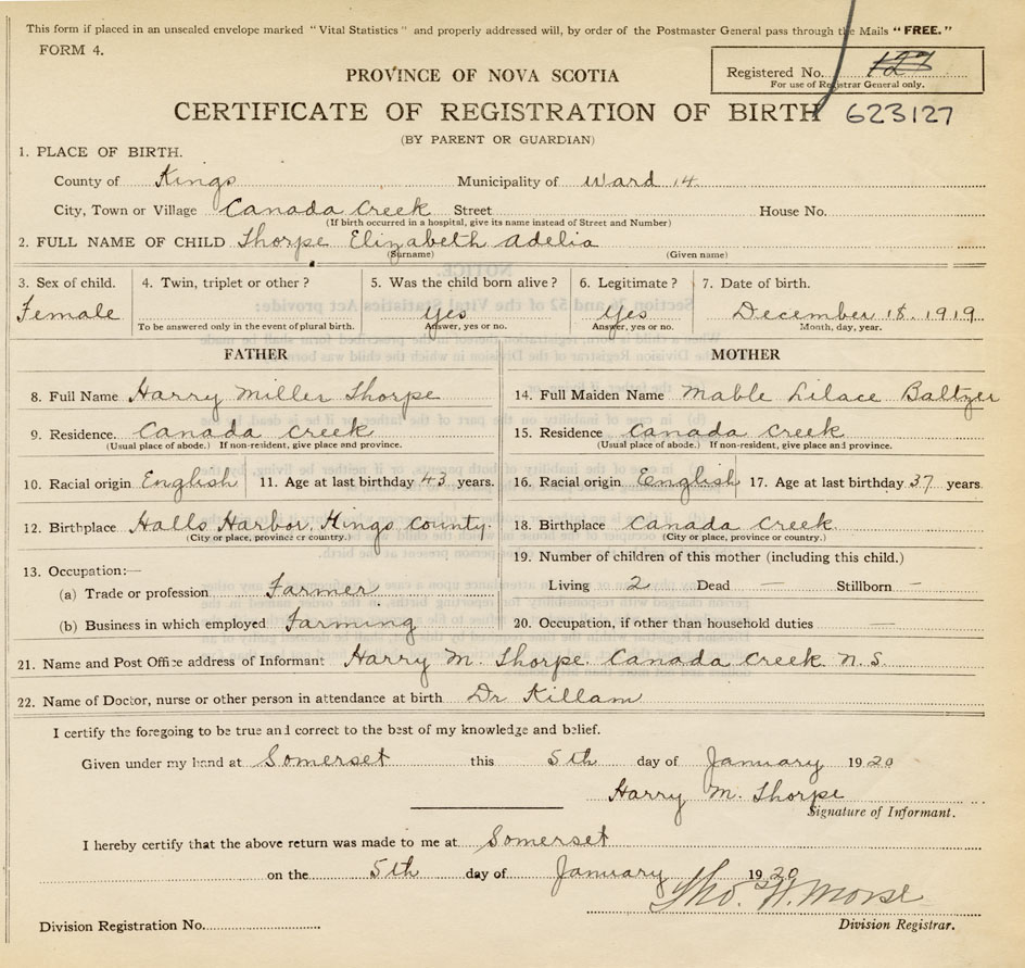 21. Name and Post Office address of Informant Harry M. Thorpe Canada Creek, Kings Co., NS