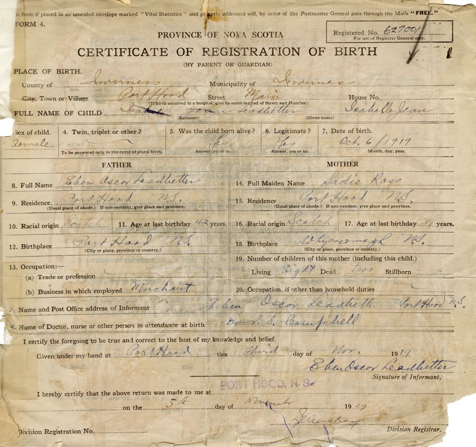 21. Name and Post Office address of Informant Eben Oscor Leadbetter Port Hood, Inverness Co., NS