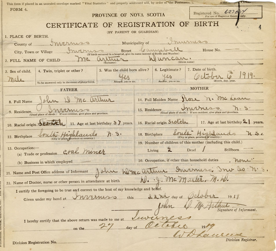 18. Birthplace South Highlands, Inverness Co., NS
