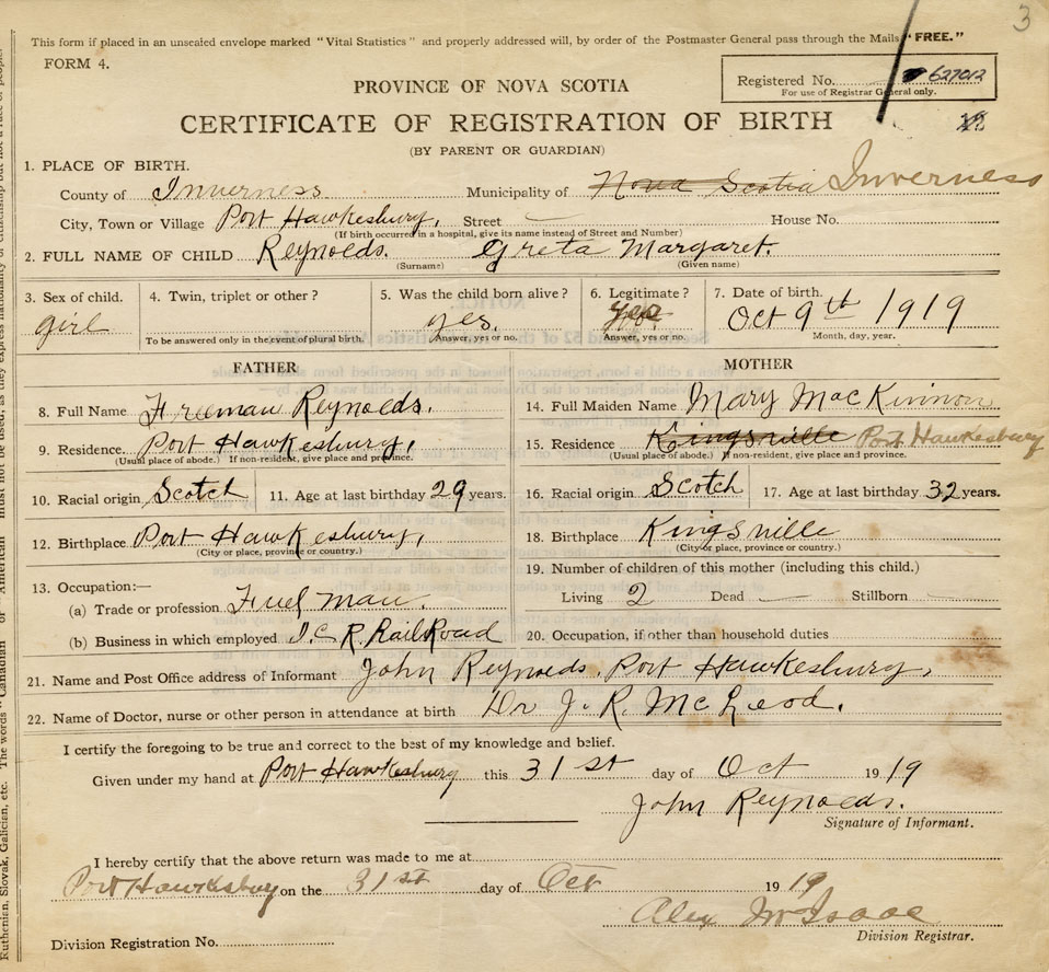21. Name and Post Office address of Informant John Reynolds Port Hawkesbury, Inverness Co., NS