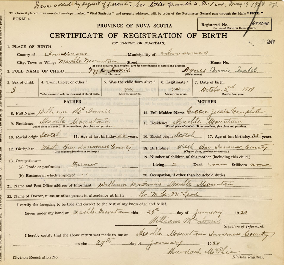 2. FULL NAME OF CHILD McInnis, Agnes Annie Isabel