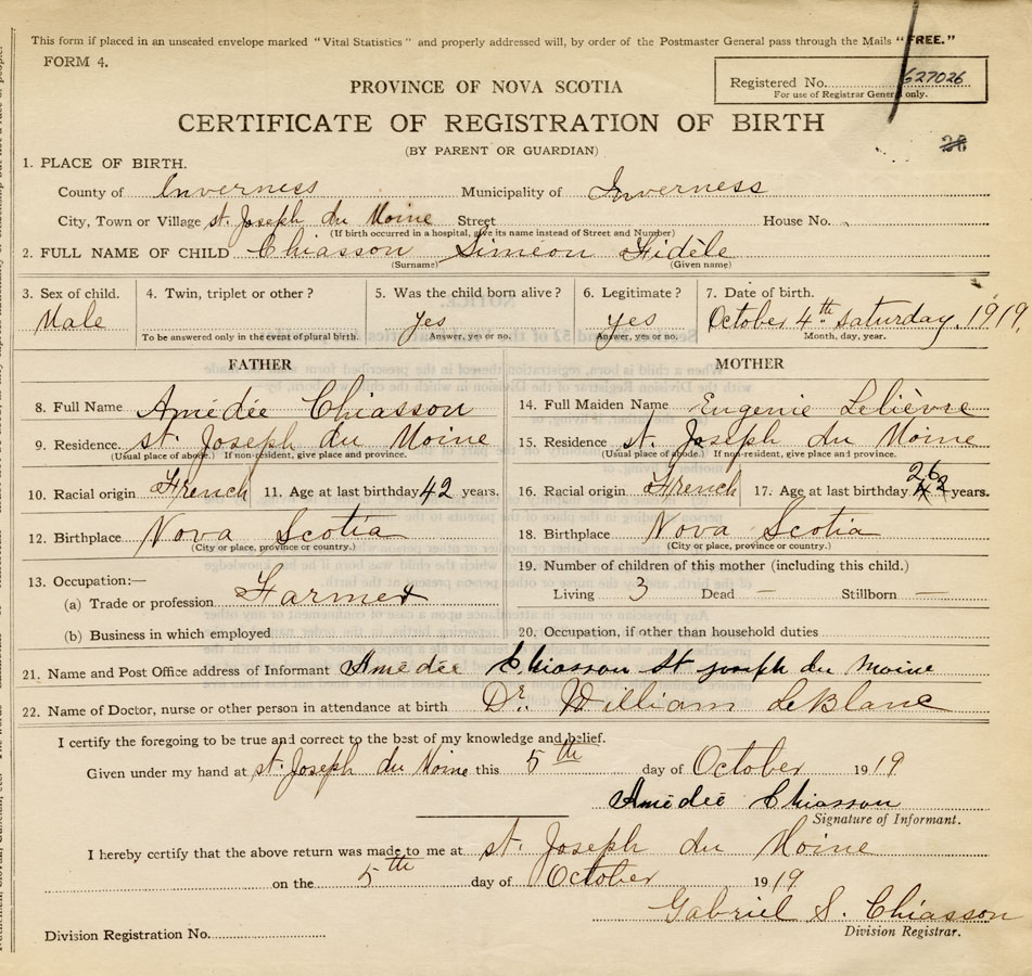 21. Name and Post Office address of Informant Amidee Chiasson St. Joseph du Moine, Inverness Co., NS