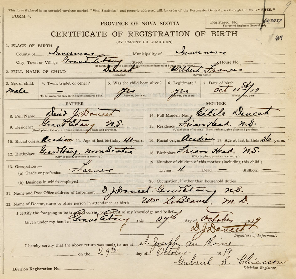 21. Name and Post Office address of Informant D. J. Doucet Grand Etang, Inverness Co., NS