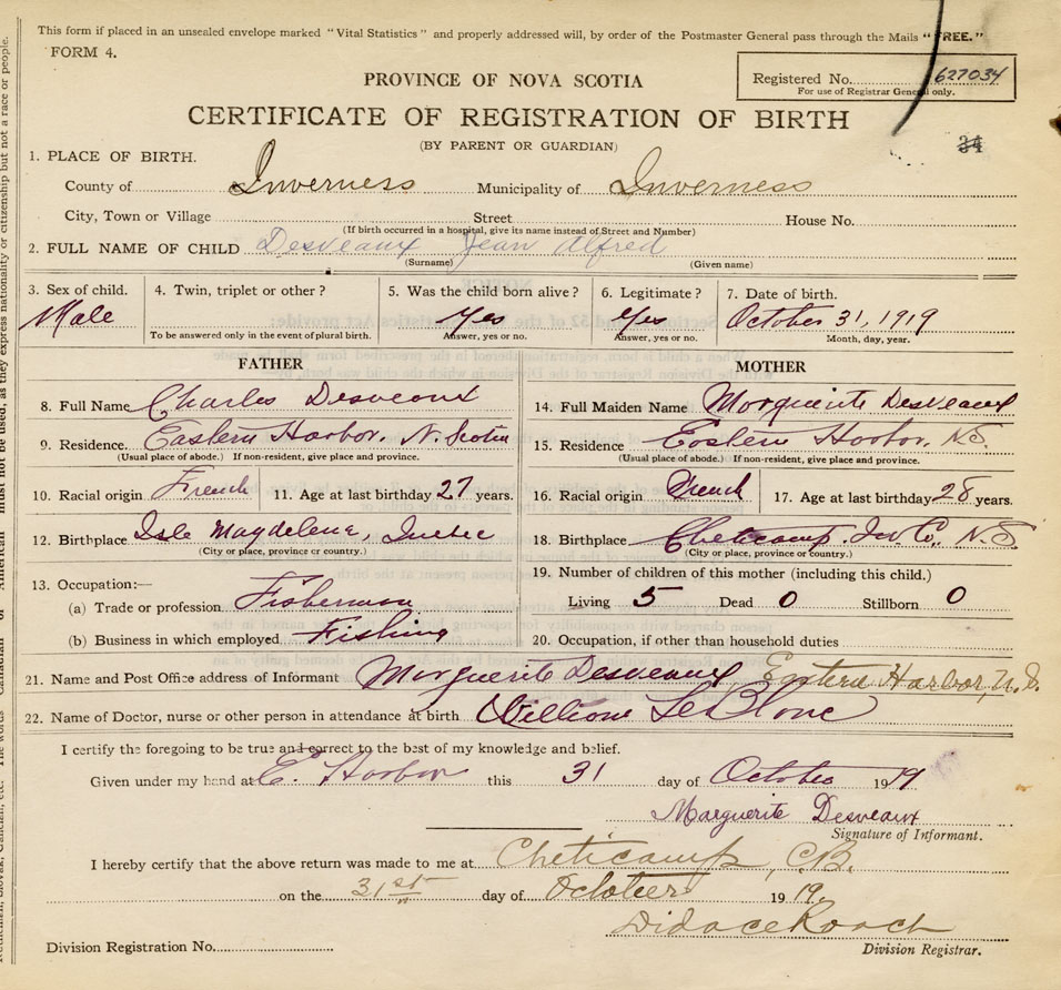 21. Name and Post Office address of Informant Marguerite Desveaux Eastern Harbour, NS