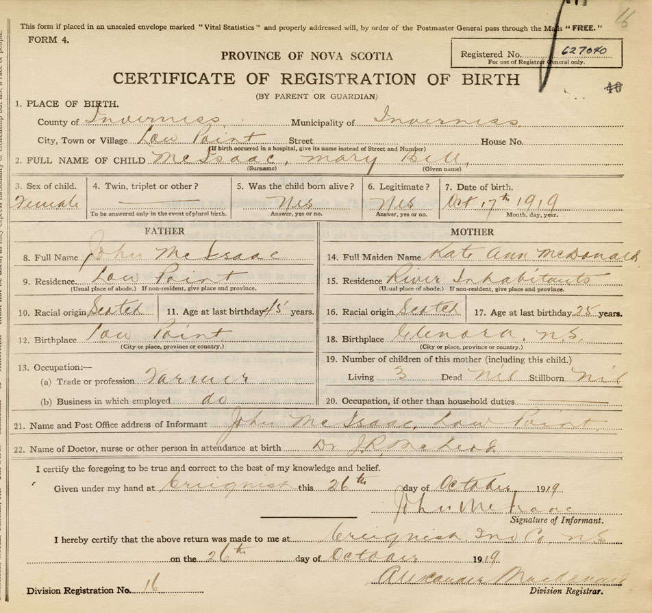 21. Name and Post Office address of Informant John McIsaac Low Point, Inverness Co., NS