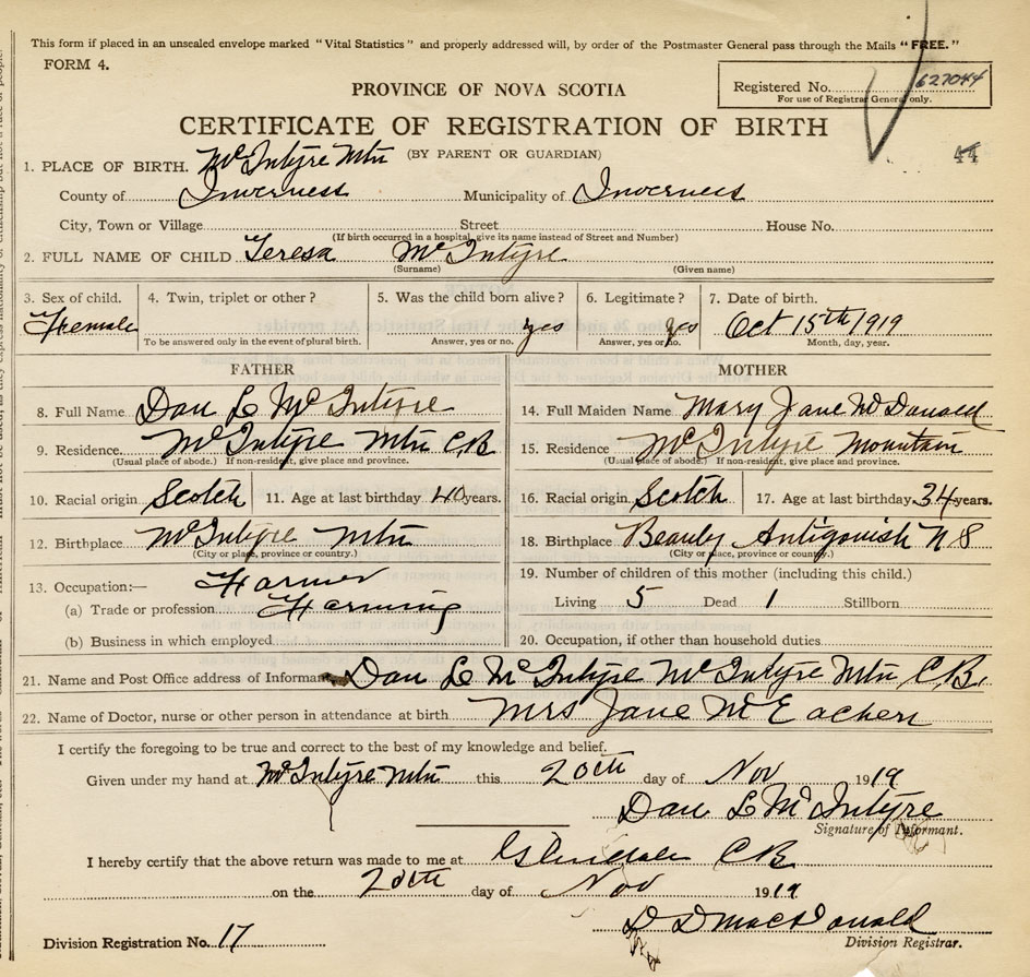 21. Name and Post Office address of Informant Dan L. McIntyre McIntyre Mountain, Inverness Co., NS