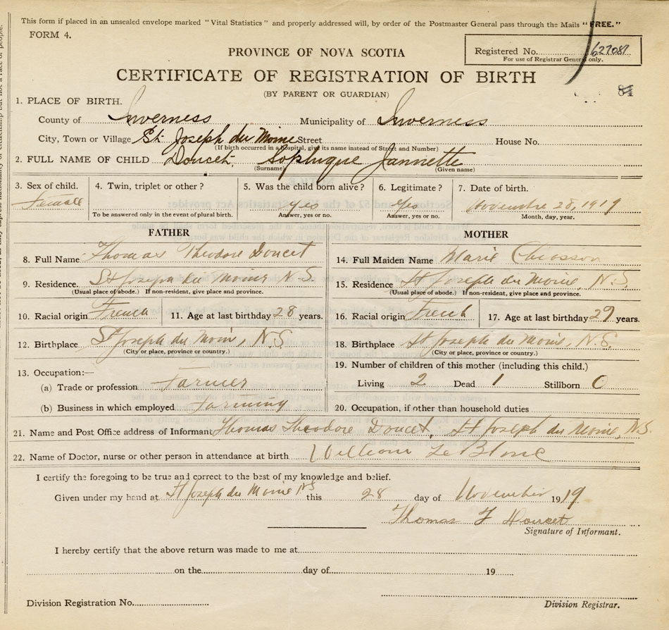 21. Name and Post Office address of Informant Thomas Theodore Doucet St. Joseph du Moine, Inverness Co., NS