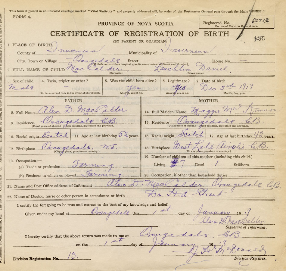 2. FULL NAME OF CHILD MacCalder, Lauchlin Daniel