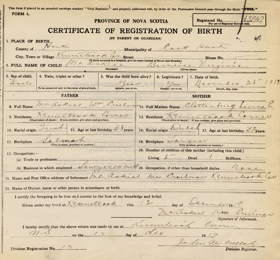 21. Name and Post Office address of Informant Mrs. Crulman McAskill Kennetcook Corner