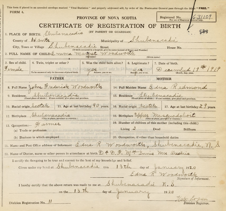 21. Name and Post Office address of Informant Edna R. Woodworth Shubenacadie