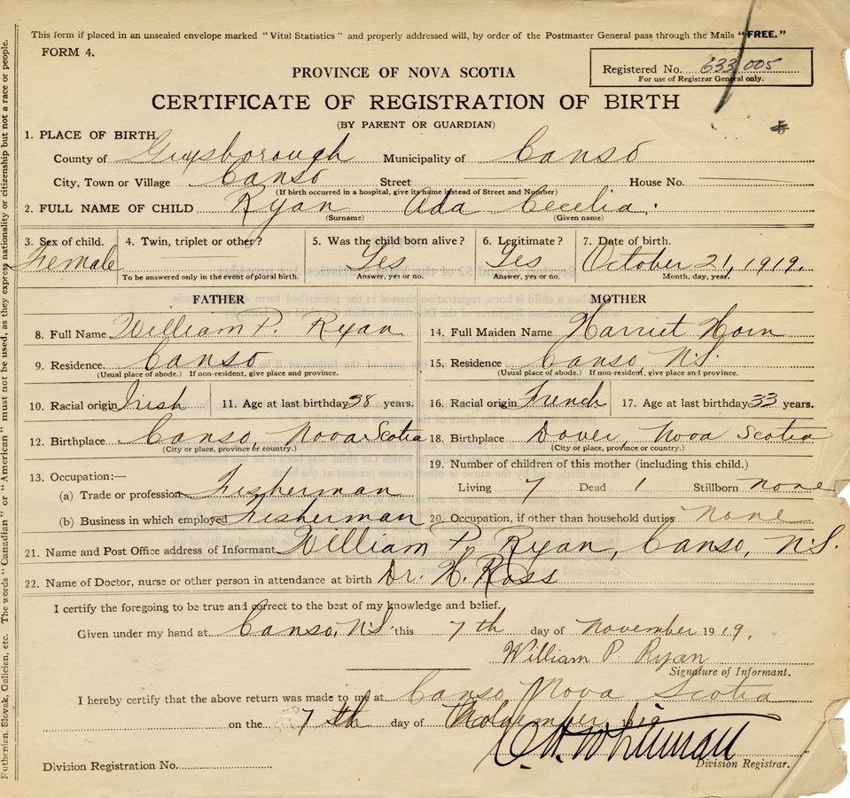 21. Name and Post Office address of Informant William P. Ryan Canso, Guysborough Co., NS
