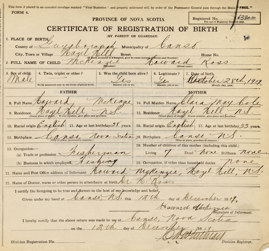 21. Name and Post Office address of Informant Howard McKenzie Hazel Hill, Guysborough Co., NS