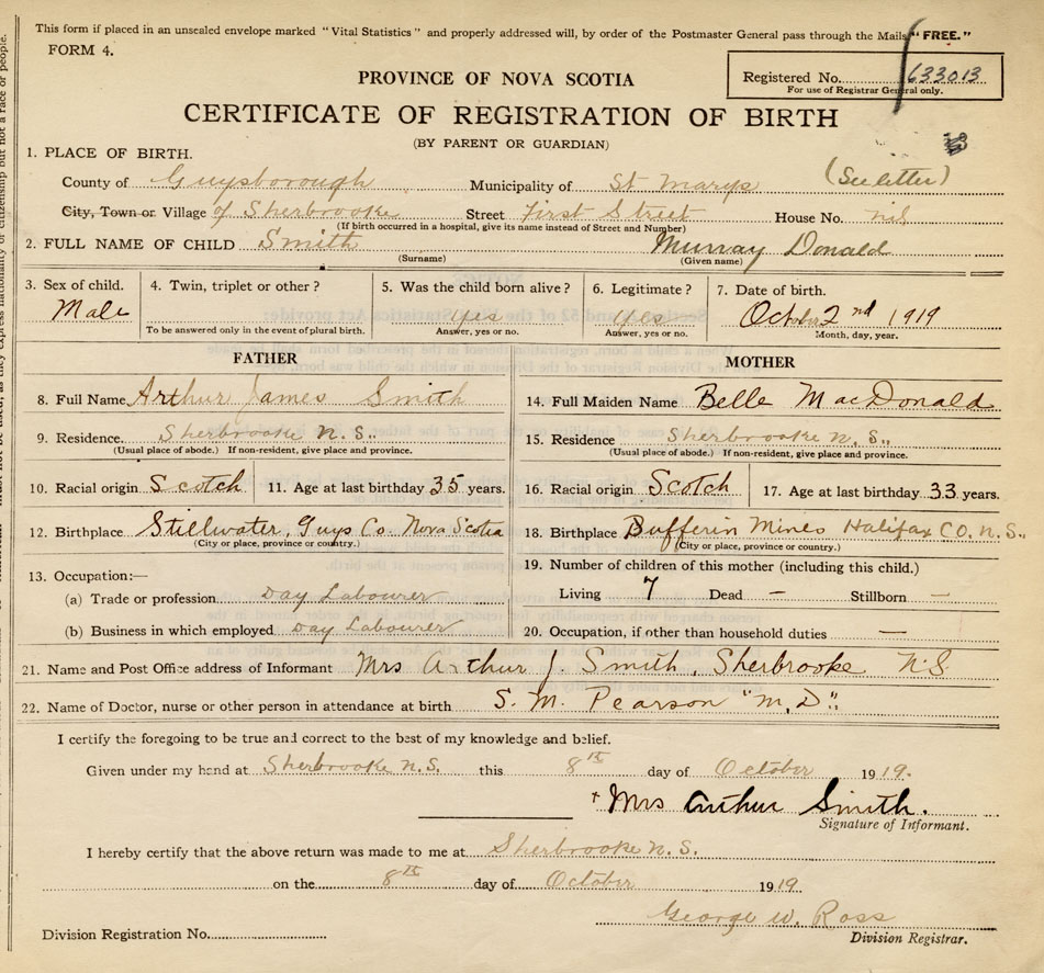 21. Name and Post Office address of Informant Mrs. Arthur J. Smith Sherbrooke, Guysborough Co., NS