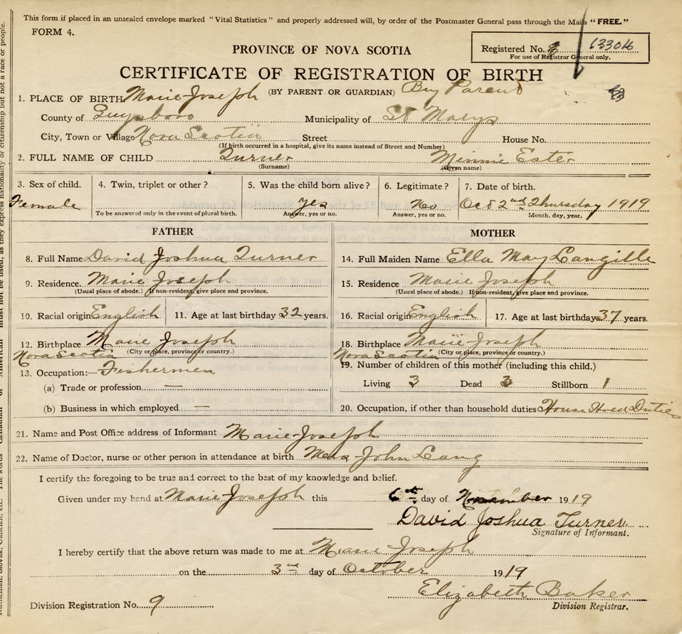 18. Birthplace Marie Joseph, Guysborough Co., NS