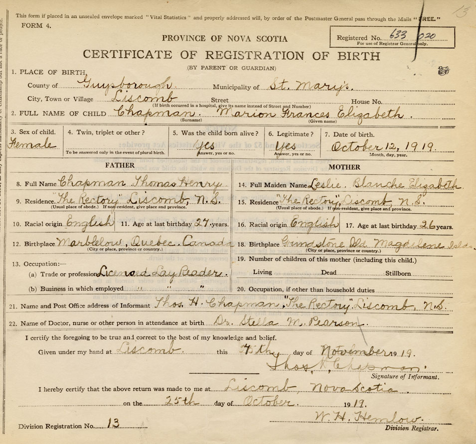 21. Name and Post Office address of Informant thomas H. Chapman "The Rectory", Liscomb, Guysborough Co., NS