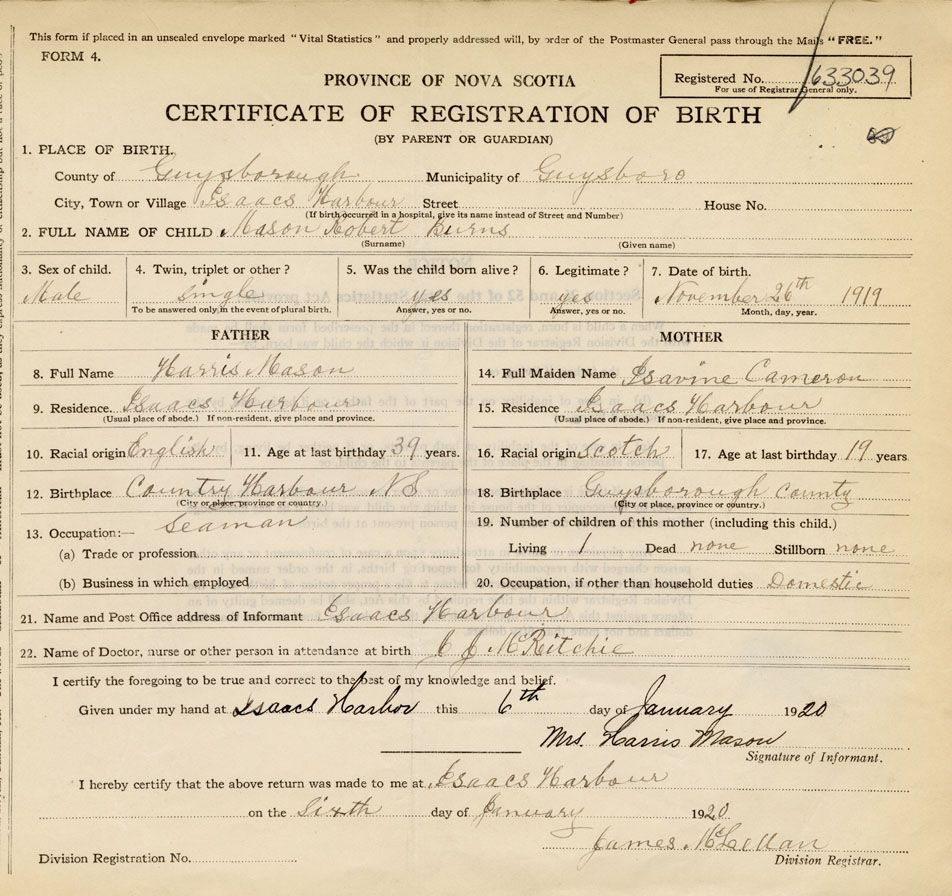 21. Name and Post Office address of Informant Mrs. Harris Mason Isaacs Harbour