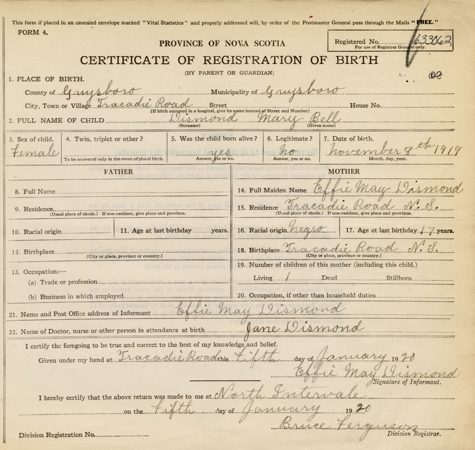 21. Name and Post Office address of Informant Effie May Dismond Tracadie Road