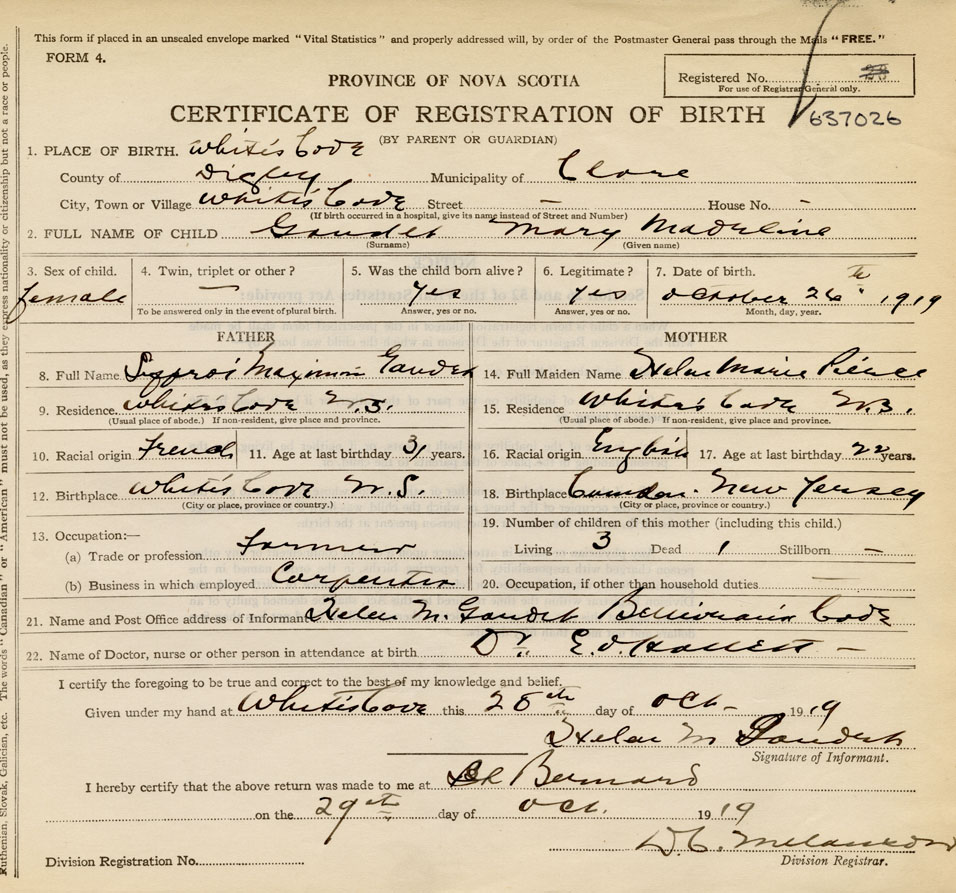 21. Name and Post Office address of Informant Helen M. Gaudet Belliveau's Cove, Digby Co., NS