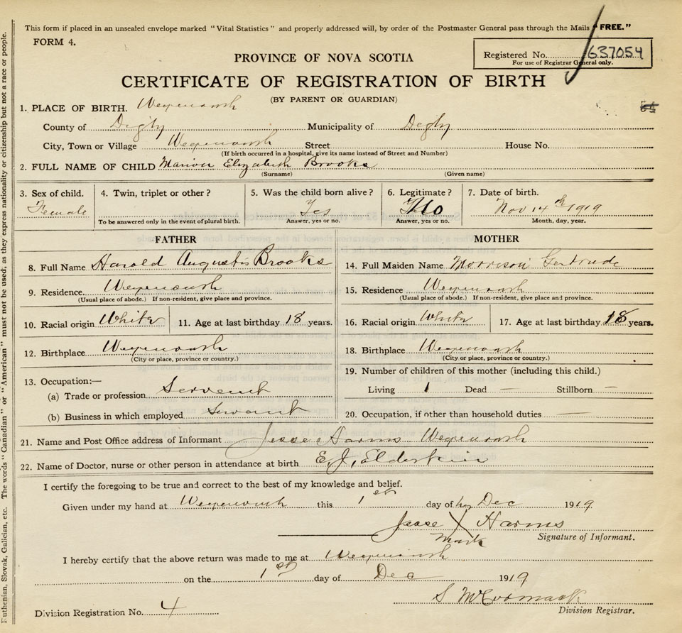 21. Name and Post Office address of Informant Jessie Harms Weymouth, Digby Co., NS
