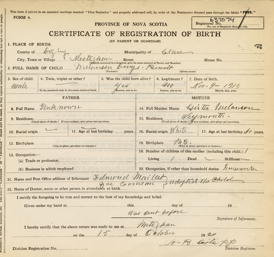 21. Name and Post Office address of Informant Edmond Maillet & Zac Comeau (adopted the child)