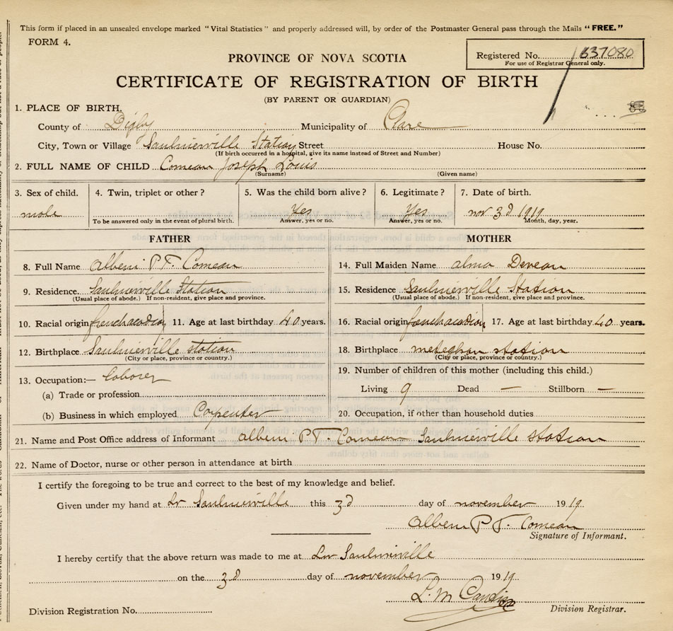 21. Name and Post Office address of Informant Albeni P. T. Comeau Saulnierville Station, Digby Co., NS