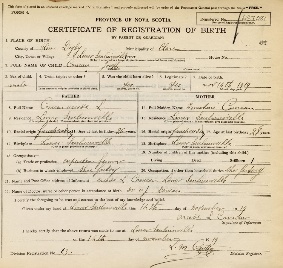 21. Name and Post Office address of Informant Arcade L. Comeau Lower Saulnierville Station, Digby Co., NS