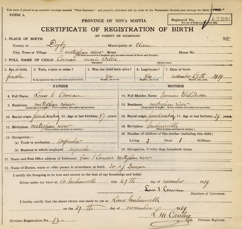 21. Name and Post Office address of Informant Louis S. Comeau Meteghan River, Digby Co., NS