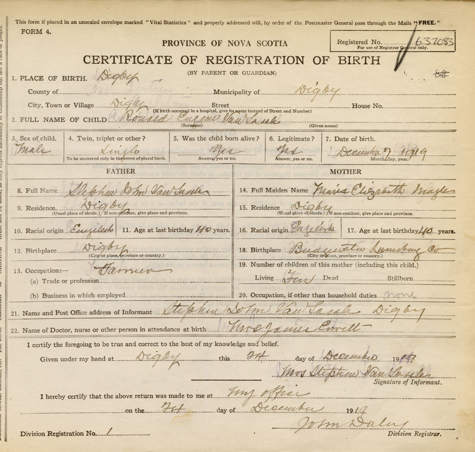 21. Name and Post Office address of Informant Stephen John VanTassle Digby, NS